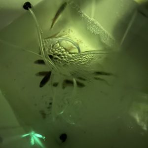 エサを生かしておくためにエアポンプ付きのクーラーボックスを準備。ここでクーラーボックスの中にライトを入れておくことがポイント!!(青く光っているのがケミホタル)
