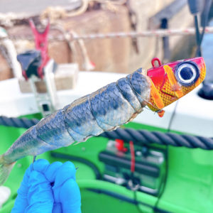 上記のカラーに加え、真ん中のパープルとその右のアカキンも、かなりの大活躍で、釣り初心者の私が船中テンヤでトップと並ぶ釣果を叩き出すレベルですごかったです👏✨