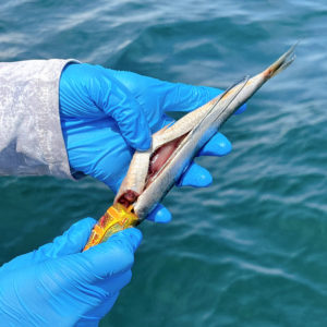 内臓は、テンヤをセッティングする際にはみ出そうな部分だけ、少量取り除く派で、切り込みからテンヤをそっと入れたら