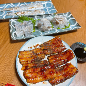 この日は、夫が蒲焼きと、刺身の炙りと、塩焼きを作ってくれ…