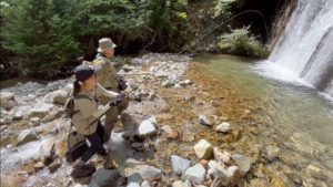 小さな瀬落ちで小さなイワナがヒット。リリースサイズではあったが、初めのうちは渇水気味で魚の姿がなかなか見えなかったので3人に希望の光が差した瞬間だった。