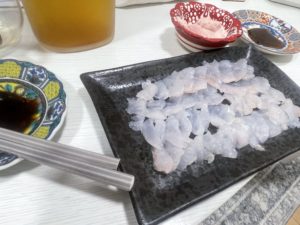 帰宅後すぐにお刺身にして、キモ醤油で実食。
