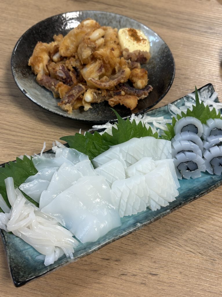 左からエンペラ細切り、薄づくり、湯引き、磯部まき🦑そして唐揚げも、、