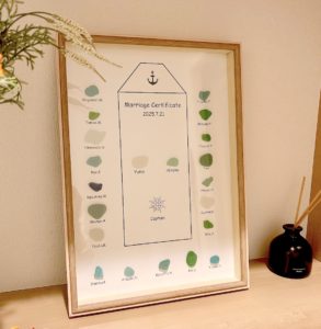 シーグラスを使って参加者が参加できるタイプのものが良かったのですが、ハンドメイド系のマーケットプレイスなどで買うとなると1,2ヶ月はかかるとのことで思いついた時にはすでに間に合わず💦結局、自分でデザインアプリを使ってベースの用紙を作り、キンコーズで印刷し、木枠とシーグラスをネットで購入し、自作しました。シーグラスは当日に参加者に好きなものを選んでもらい、接着剤でつけました!思ったよりも良くできました!!