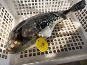 鯛のようにぐぐん!っていう引きにワクワクしながら上がってきたのはなんとキロアップのトラフグちゃん♥️♥️