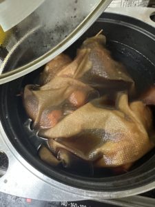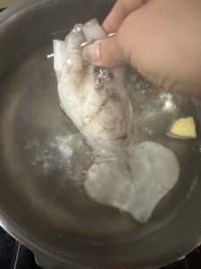 まずはお湯にお酒と生姜1かけ入れて下茹でしていきます。