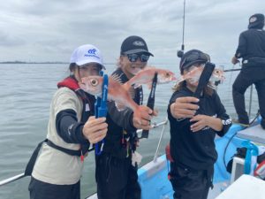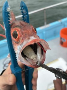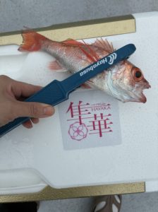 隼華11期のくみこです😊 ノドグロの愛称で知られ 高級魚としても有名なアカムツ🐟 念願叶ってついにアカムツ便に乗船してきた日を 振り返ります☺️ 今回お誘いいただいたチャーター船は @toyama_fabula ファブラさん🛥️ ハヤブサのアカムツ仕掛けと冷凍ホタルイカ携えて ルンルン気分でいざ出航🎶(*´∀`)♪ 仕掛けの鈎にホタルイカを引っ掛けて 水深100m付近を底狙いで探る😎 一投目はまさかの太刀魚にPEを切られて 仕掛け丸ごとロストの悲劇からのスタート😰 再開!と思ったら今度は 仕掛けを落とす途中でサバがヒットして 仕掛けがグッチャグチャに😱あーんもうヤー😫 気を取り直してようやく着底と…😮💨笑 今度は当たりが全く無くて当たりが取れてないのか アカムツがいないのか疑心暗鬼に😂 そうこうしながら何度かポイント移動した後に ちっちゃいコンコン! が手元に伝わってついに待望のHIT‼️ ほーんとちっちゃい当たり過ぎて上がってくるまで アカムツか不安だったけど…アカムツでした😊👍それからは当たりが分かるようになって 繊細な当たりを掛けてくのが楽し〜い⸜( ´꒳`)⸝ 掛けた後、水深30m付近まで巻き上げてくると アカムツが光に反応するのか?イヤイヤってして ゴンゴンって底を叩いてバレそうになるのが スリルがあって面白い😆👍