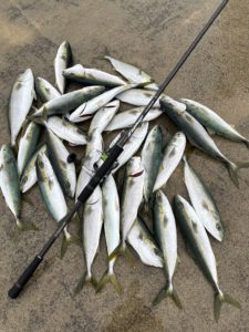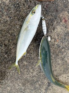 隼華11期のくみこです😊 今回はショアジギングで爆釣したときのことを振り返ります 予報では止むはずの雨が降り止まず☂️ 土曜日なのに釣り場はほぼ貸切状態 40gのハヤブサのメタルジグ ジャックアイマキマキ 何度か試し投げをしつつその出番を静かに待つ 突如としてその時はスタートした! 遠投してカウント5で着底を待たずに ワンピッチジャークからのフォールをした瞬間に 水面のPEラインが激しく振動する!🫨 すかさず合わせると青物特有の直線的な走り😆 キタキタきた〜!!!! この日この時間この場所に賭けて 青物が回遊するタイミングを待っていた 回遊があったとしても 爆沸きするかどうかは一か八か勝負🔥 結果、大当たり🙌 もはやエサと化したメタルジグは一投するだけで フロントフックとリアフックそれぞれに1匹ずつの 二連掛け🍒もお手のもの🤭